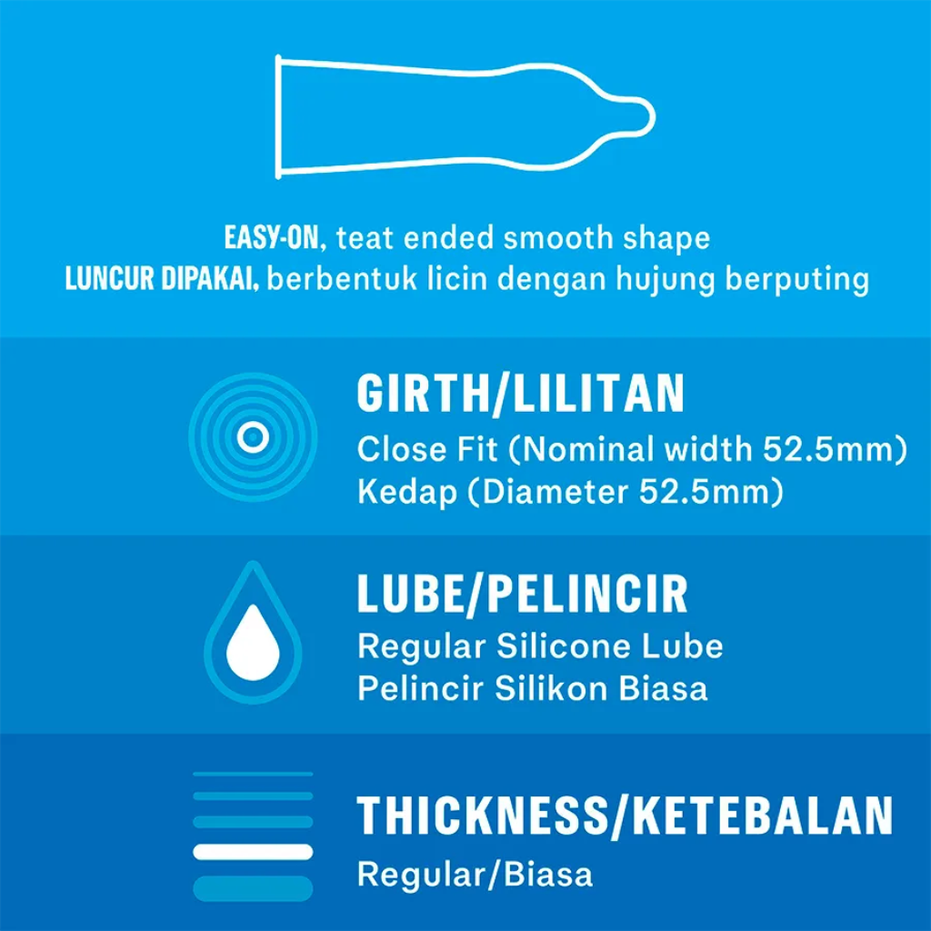 - Close Fit size (nominal width: 52.5mm), latex condoms with regular silicone lube