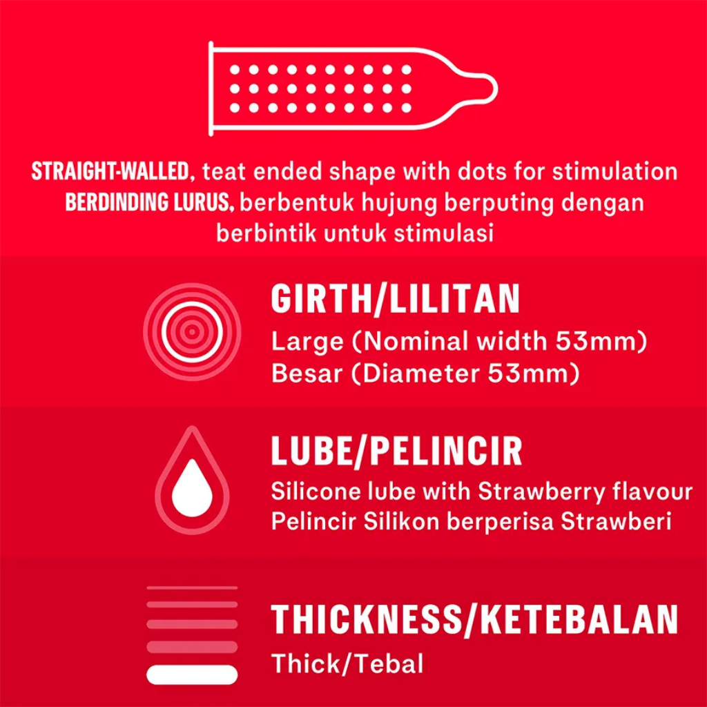 Experience Durex's new range of sensually flavoured condoms designed to take her for an adventure. Durex Strawberry Condoms are dotted to provide additional stimulation. Pink coloured, lubricated condoms shaped with a straight wall and teat end to provide a better fit during sex.