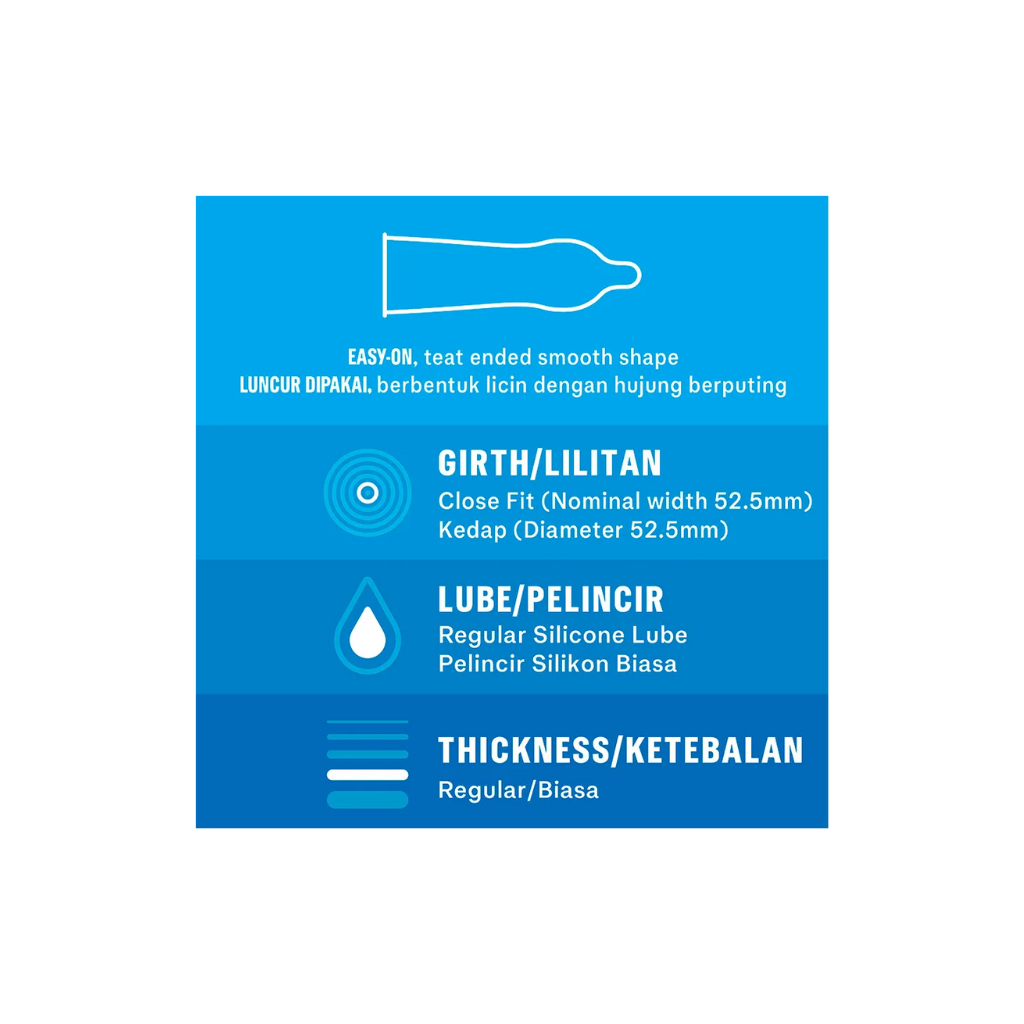 - Close Fit size (nominal width: 52.5mm), latex condoms with regular silicone lube