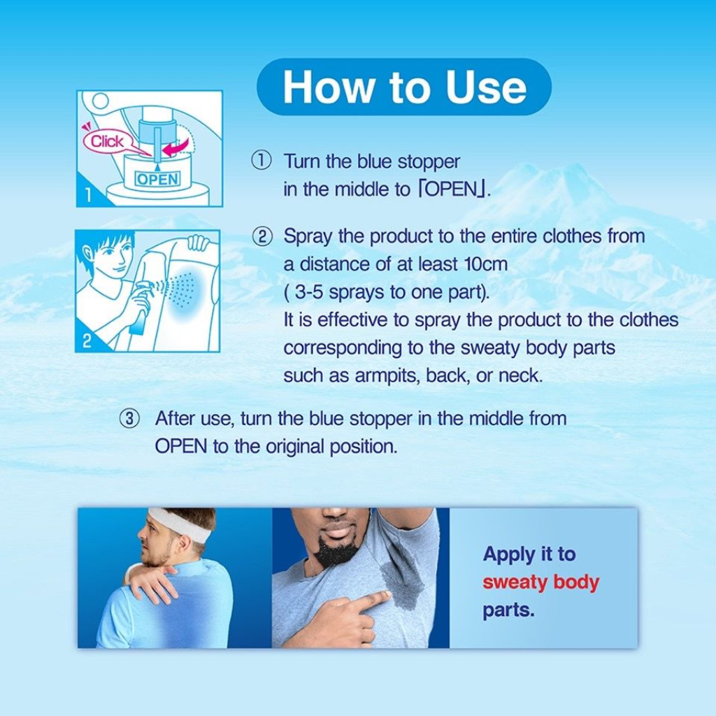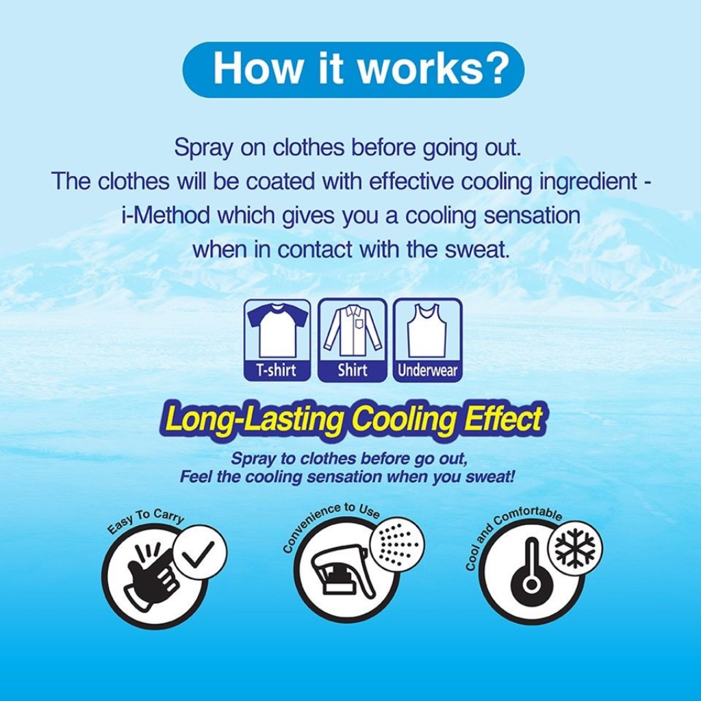 Cooling Spray for shirts with Long-Lasting Cooling Effect. Effective by spraying to the clothes corresponding to the sweaty part of the body such as armpit or back. Spray to your clothes before you go out, you will feel cool when you sweat outside